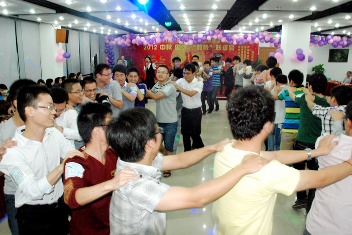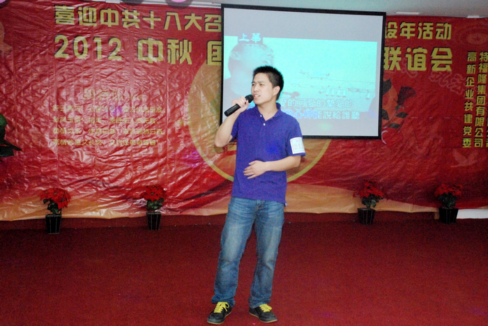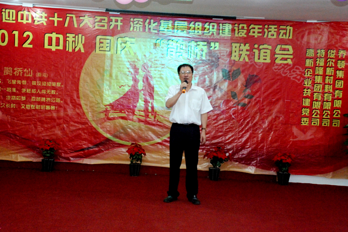 海上生明月,天涯共此时。在这中秋佳节来临之际,由高新企业共建党委组织了特福隆集团有限公司、浙江俊尔新材料股份有限公司、乔顿集团有限公司三家企业,联合在特福隆集团二楼多功能厅举办了“喜迎十八大中秋 国庆‘鹊桥’联谊会”。出席本次晚会的有龙湾区委组织部两新科副科长金鑫,高新企业共建党委书记、特福隆集团党总支书记李锦硕,俊尔新材料常务副总、工会主席朱春光,乔顿集团常务副总、党支部书记华世炜。三大企业80多位单身男女青年参加了本次‘鹊桥’联谊会。