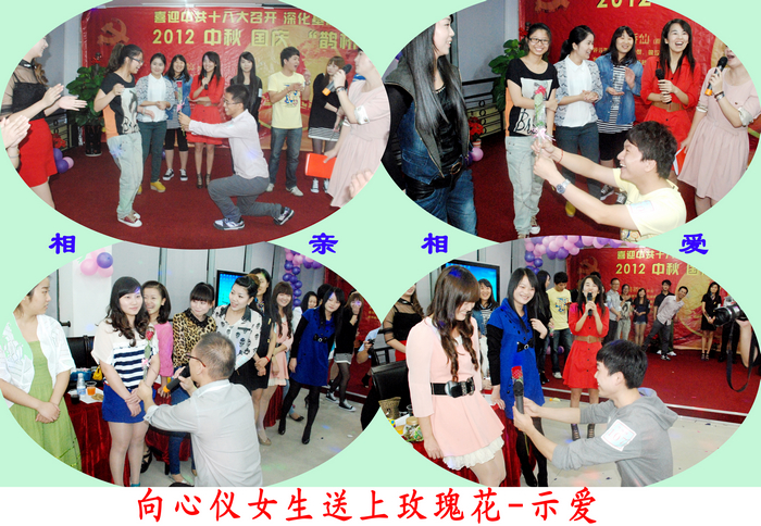 首个节目就是各个公司的男女青年分别展示了才艺,让心仪的对象有个好印象,接着是男士为心仪的女士送上水果饮料及玫瑰花。整台联谊会节目形式多样,互动配合,如猪八戒背媳妇、你比我猜、集体抛绣球、甜蜜时刻等各类互动男女配合的游戏节目。晚会在一场集体舞蹈中步入高潮,通过互动并在最后表白环节中牵手成功十几对中落下帷幕。