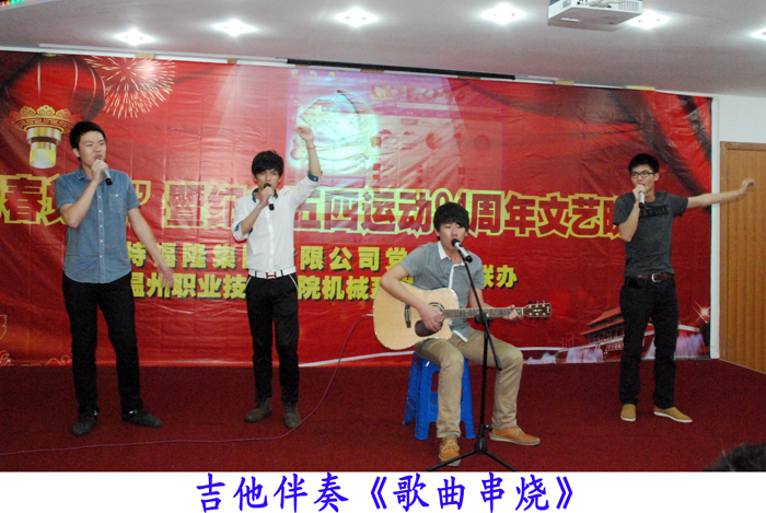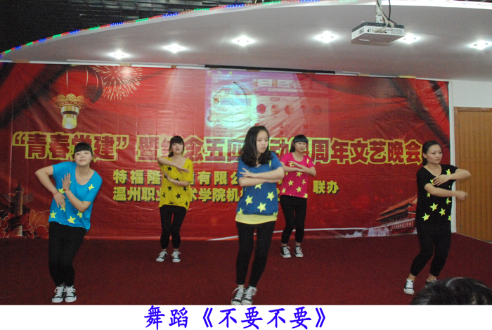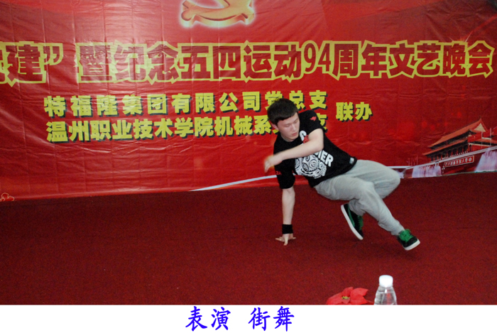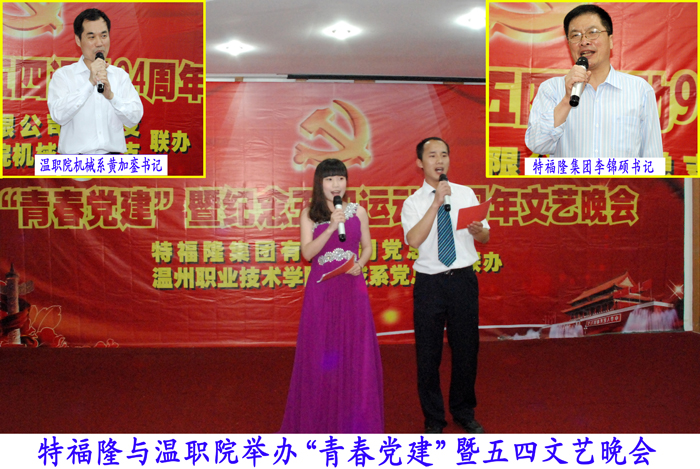 红五月,特福隆集团有限公司与温州职业技术学院机械系联合举办“青春党建”暨纪念“五四运动”94周年文艺晚会,晚会在特福隆集团二楼多功能厅举行。特福隆集团有限公司党总支书记、常务副总李锦硕,工会主席、生产副总陈更新,党总支委员、生产副总徐建仁,以及温州职业技术学院机械系党总支书记黄加銮、温职院机械系