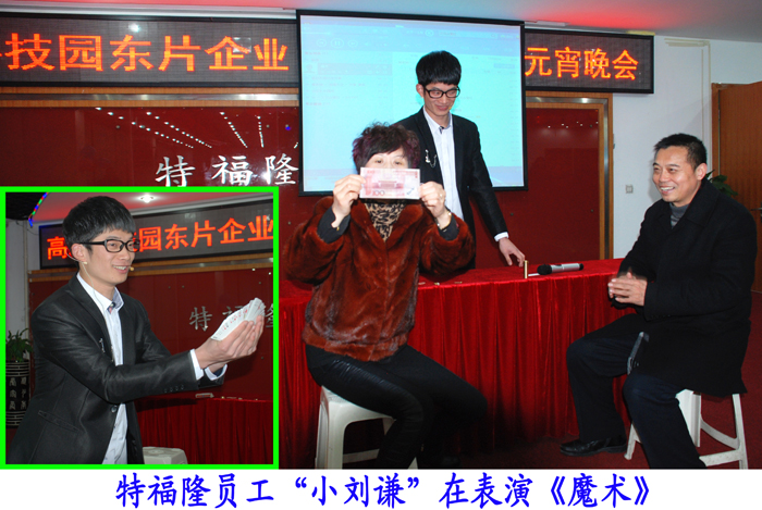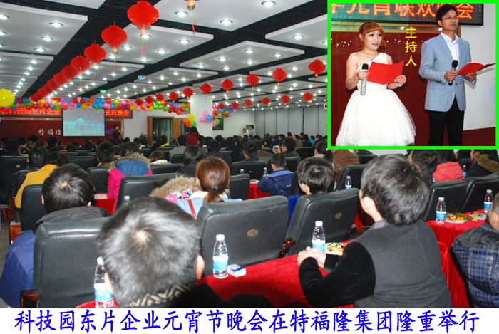 欢欢喜喜过大年,红红火火闹元宵。马年元宵节的晚上,特福隆集团文化礼堂的元宵节活动的声音响彻科技园东片大地。由高新区科技园东片企业联合党委组织的《科技园东片企业2014年元宵节联欢晚会》,有10多家企业的160多人参加了晚会热闹非凡。