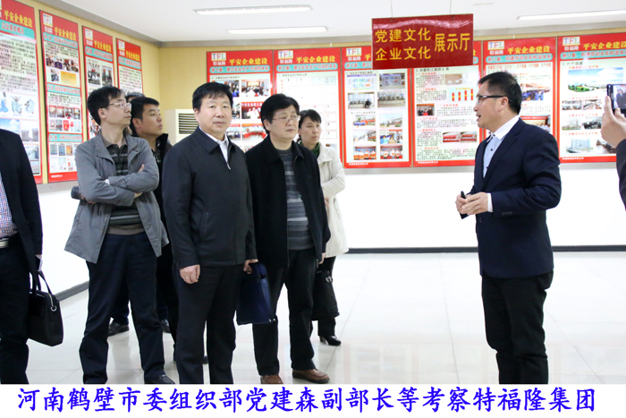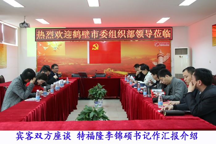 在党总支书记、常务副总经理李锦硕的汇报介绍下,鹤壁市党建森副部长一行先后参观了特福隆党建文化展示厅和党工团三个办公室,来宾们对特福隆集团用方方面面的真实活动照片来展示非公党建工作,很充实很生动很满意。之后来宾一行来到特福隆党员活动中心座谈,李锦硕书记汇报了一是特福隆在1999年党建工作的艰难起步,由于特福隆党组织有作为,然而就有地位、有成就、有辉煌,也充分展示了党组织在非公企业中的核心领导作用;二是特福隆党建工作开展的三大目标、六大任务和十大保障机制,规范了非公党建工作的有序开展;三是特福隆共产党员发挥先锋模范作用,在企业的科学发展与转型升级中发挥重大作用,特别是攻克“国产化新产品”的技术壁垒中,共产党员吃苦耐劳在前、连续奋战加班加点在前,党员的表率作用也受到了企业主与广大群众的好评。