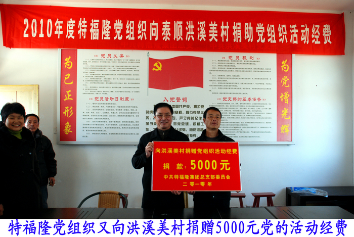 二是开展城乡党组织结对共建。当得知溪美村党支部缺少党员活动经费时,特福隆集团党组织又捐出5000元,资助洪溪美村党支部开展活动经费,实践城乡党组织互动,开展互帮互学活动,共同开展创先争优活动,开展共同学习十七大文献资料,交流城乡党建工作经验。