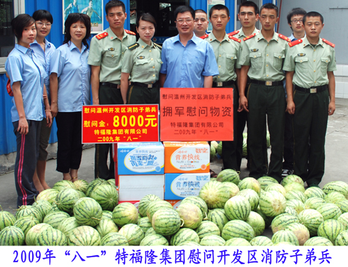 特福隆集团自2002年以来每年都有开展拥军活动,军爱民、民拥军,军民团结一家亲。今年是建军82周年,81日上午,特福隆集团党总支书记常务副总经理李锦硕、工会副主席蔡爱华、特福隆共青团书记胡建森等,带着对消防子弟兵的深情厚谊,专程来到温州经济技术开发区消防大队,慰问长期奋战在灭火、救灾第一线的消防子弟兵,并为官兵们送去了慰问金8000元及一批慰问物资(1000斤西瓜与300瓶饮料)。