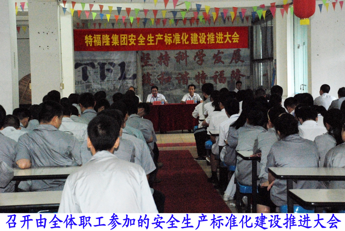 为加强安全生产的意识深入人心,特福隆集团在食堂召开全体职工安全生产标准化工作建设推进大会。集团党总支书记、常务副总李锦硕强调,推进集团安全生产标准化建设工作,要强化措施,扎实推进,确保完成达标任务。集团办公室副主任王元宵主持大会,会议由公司全体员工参加。