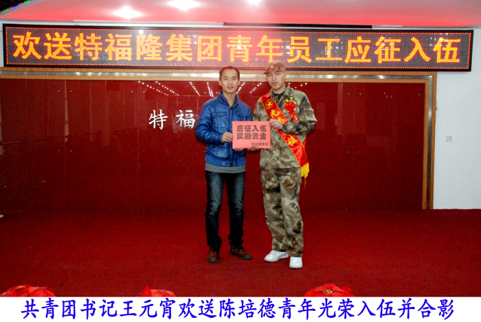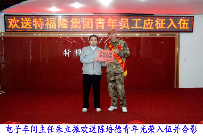 适龄青年应征入伍是公民应尽的光荣义务,前几年特福隆都有为员工光荣入伍举行欢送。最近,特福隆集团再度举行了“欢送特福隆集团青年员工应征入伍”仪式,在欢送仪式上特福隆党组织书记李锦硕向光荣应征加入中国人民解放军并即将踏上征程的陈培德同志表示热烈的祝贺!李书记亲切地勉励陈培德同志说:青年人去应征入伍是你人生一个新的转折点,你现在迈进“军营大学校”,要书写人生新篇章,在光荣的人民军队里要造就当代英雄,你一定刻苦磨练,尽职尽责、严明纪律、精忠报国,把自己锻炼成一名优秀的中国人民解放军一兵,为特福隆集团和温州家乡父老多争荣誉、多立新功,经得起各种风浪的考验,圆满地完成党和人民赋予的神圣使命。