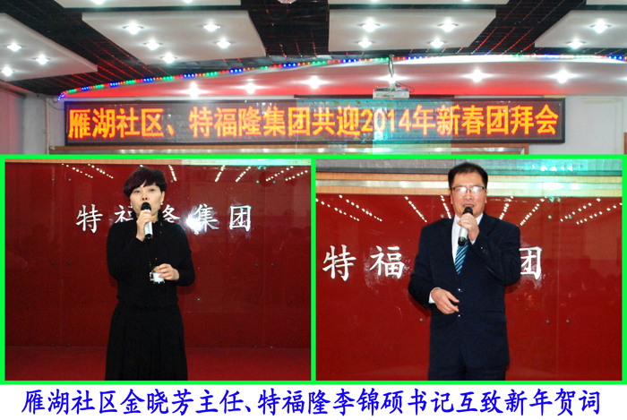 特福隆集团与雁湖社区结对共建和谐文明,已经有整整五年了,期间双方一直有开展活动,双方党员开展缅怀革命先烈、慰问社区弱势群体、红歌大合唱、重阳节联谊会、端午节元宵节社企互动等。2014年新春伊始,特福隆集团与雁湖社区在特福隆文化礼堂又举办了“共迎2014年新春团拜会”。