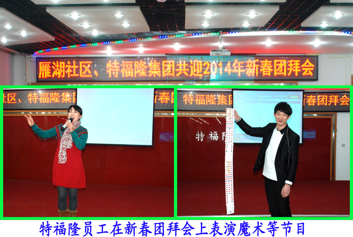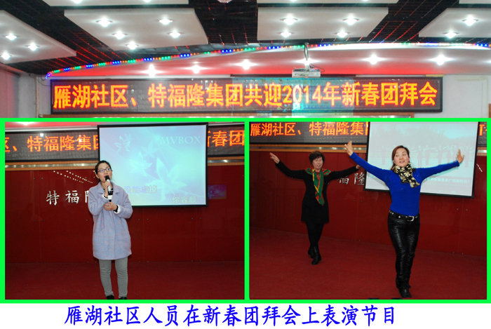 新春团拜会上,雁湖社区工作人员和特福隆集团员工都纷纷上台献上新春的祝福,同时还献上了文艺节目:有舞蹈、魔术、K歌及男女对唱等。