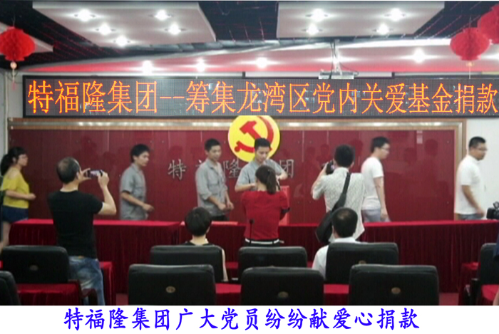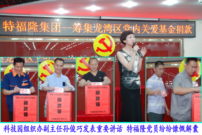 近日,在特福隆集团二楼文化大礼堂,开展了筹集党内关爱帮扶基金的捐款活动,特福隆集团在温州的全体党员参加了捐款。此次特福隆党员开展的捐款是以自愿为原则,在筹集党内关爱基金的捐款现场,高新区科技园组织办孙俊巧副主任发表重要讲话,高新科技园东片企业联合党委书记、特福隆集团党总支书记李锦硕也作了讲话,他说:“关爱困难党员,嘉奖先锋党员“闪光言行”,建立党内帮扶机制,增强党组织的凝聚力和感召力,营造党组织内部团结互助,促进党内和谐,希望特福隆全体共产党员踊跃参与,积极献爱心”。李锦硕书记带头个人借款1000元,紧接着特福隆党员纷纷慷慨解囊,献出自己的一片爱心,在短短的时间里筹集党内关爱基金捐款共计4678元,此善款将上交给龙湾区区委组织部。